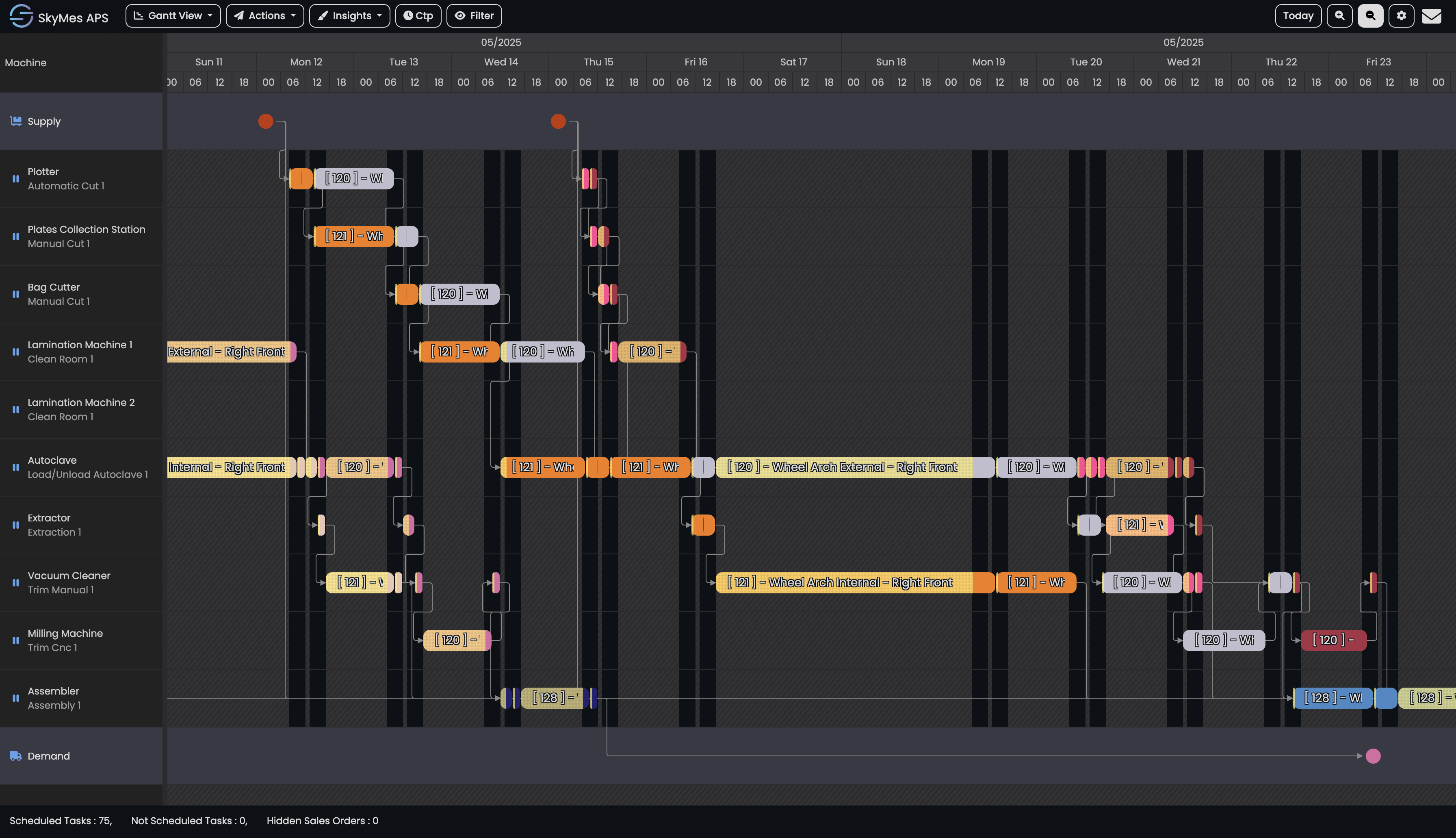 SkyMes APS intelligently plans your production using finite capacity scheduling, real‑time inputs, and what‑if simulations. It reduces delays, aligns workloads with demand, and helps teams react instantly to production shifts—keeping operations efficient and flexible.